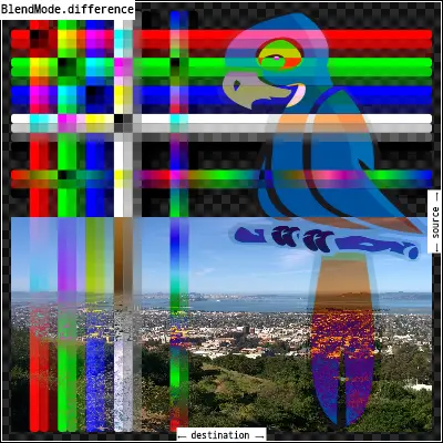 difference: 从每个通道的大值中减去小值。合成黑色没有效果;合成白色使另一幅图像的颜色相反。输出图像的不透明度计算方法与[srcOver]相同。这种影响类似[exclusion],但更为严重。