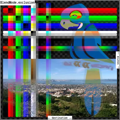 exclusion:从两个图像的和中减去两个图像的乘积的两倍。合成黑色没有效果;合成白色使另一幅图像的颜色相反。输出图像的不透明度计算方法与[srcOver]相同。效果类似[difference],但更柔和。