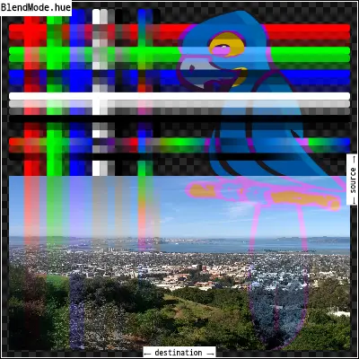 hue:取src图像的色调,以及dst图像的饱和度和亮度。其效果是将dst图像与src图像着色。输出图像的不透明度计算方法与[srcOver]相同。在src图像中完全透明的区域从dst图像中获取它们的色调。