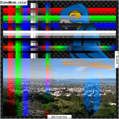 color:取src图像的色调和饱和度,以及dst图像的亮度。其效果是将dst图像与src图像着色。输出图像的不透明度计算方法与[srcOver]相同。在src图像中完全透明的区域从dst图像中获取它们的色调和饱和度。