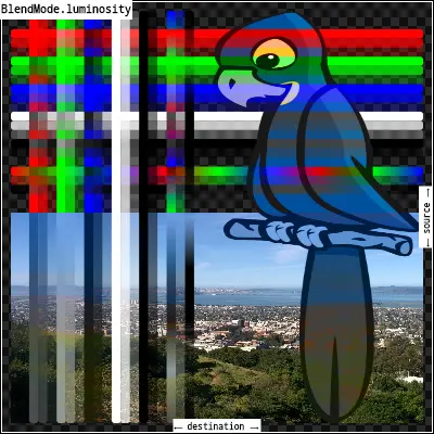 luminosity:取src图像的亮度,以及dst图像的色调和饱和度。输出图像的不透明度计算方法与[srcOver]相同。在src图像中完全透明的区域从dst图像中获取亮度