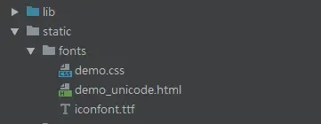 然后把下载到的ttf文件拷贝到自己项目中,我是放在static/font下,保留demo.css和demo_uniconde.html文件是为了方便的查找需要的图标的Unicode码