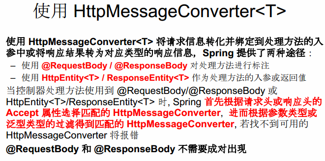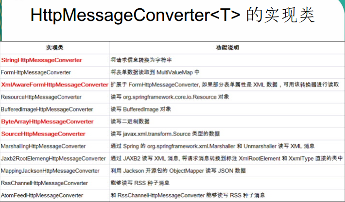 HttpMessageConverter<T> 是 Spring3.0 新添加的一个接口,负责将请求信息转换为一个对象(类型为 T),将对象(类型为 T)输出为响应信息