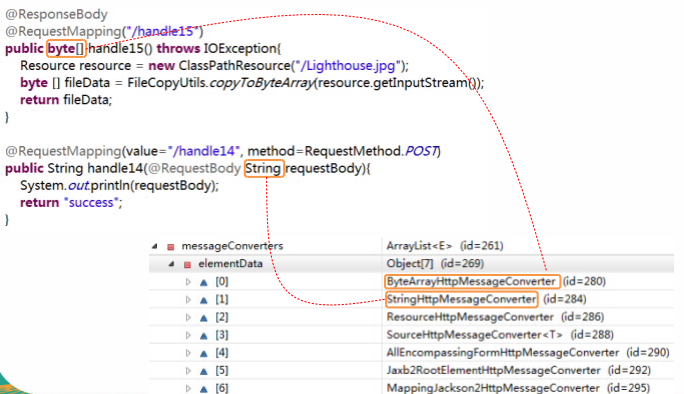 处理请求时,由合适的消息转换器将请求报文绑定为方法中的形参对象,在这里,同一个对象就有可能出现多种不同的消息形式,比如json和xml。同样,当响应请求时,方法的返回值也同样可能被返回为不同的消息形式,比如json和xml。