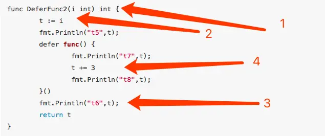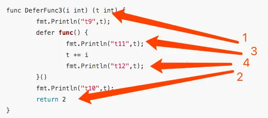 4.t7的时候接收到了t的值为1,t之后+3=4,t8接收也是4,但是在返回的时候由于t的作用域只是该函数内,所以返回的t的值并没有被defer内的操作替换,依旧是1