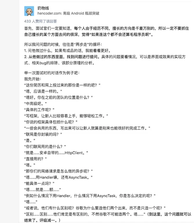 第二个方向是简历之外的内容提问。这个得先看你面试的职级,比如中级和初级开发,你得明白四大组件的基本生命周期吧,你得明白 Java 的基本基础吧,你得明白基本的自定义 View 吧。对于高级和资深,你得好好准备一下多线程、复杂自定义 View 以及动画,得知道多点触控这些吧。还有一些就是面试官所在的公司迫切希望解决或者是他们之前的问题后面得到解决的内容了。