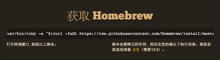 下载homebrew的地址经常会变,一定要去Homebrew — OS X 不可或缺的套件管理器这里拿最新的下载地址