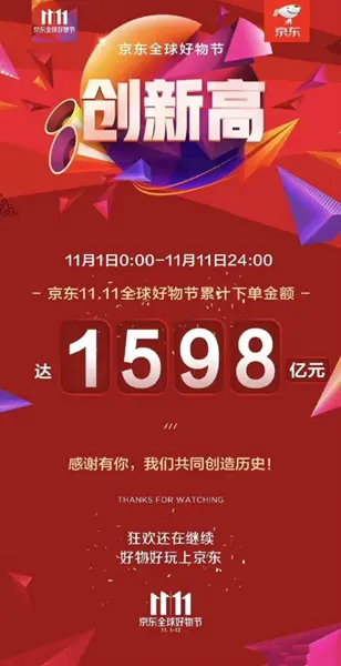 随着双十一购物盛会落下帷幕,各大电商平台纷纷公布出自己今年的成绩。与其它同行不同的是,京东除了公布1598亿的线上下单金额,还公布了线上线下融合的战果。