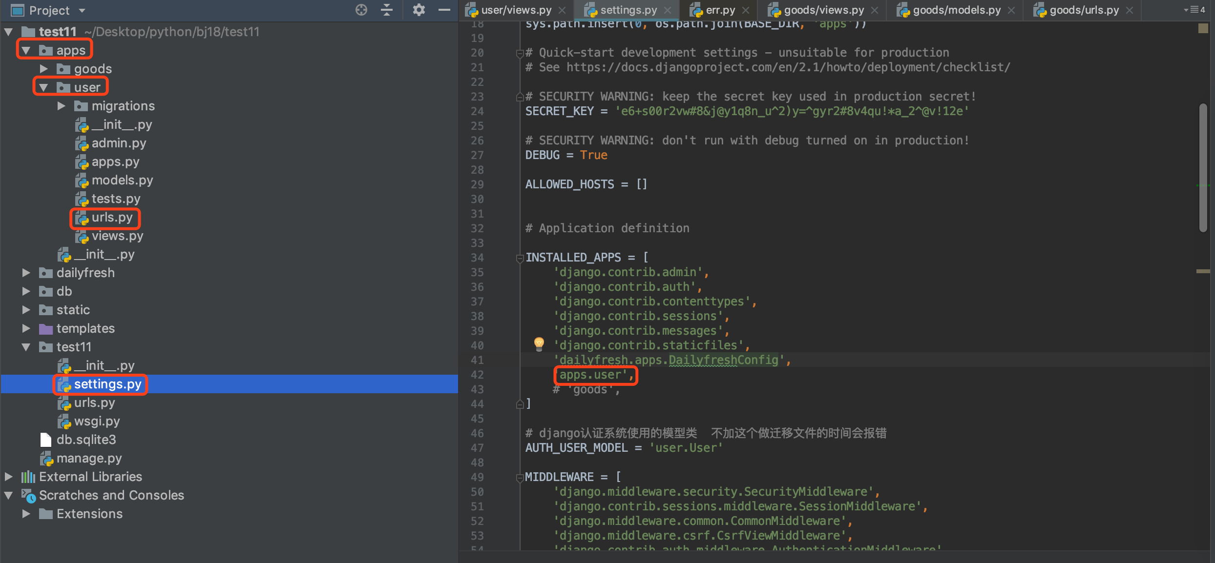 - Django 2.0之后使用了新的方式,如果我们建立了 apps 文件夹我们在 project 下的 settings.py 中使用 'apps.user' 的方式引用