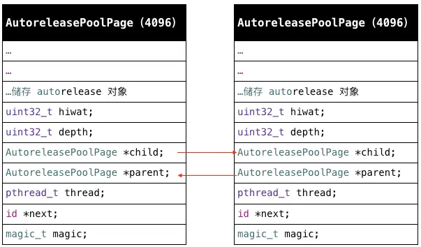 自动释放池实际上是封装的 AutoreleasePoolPage 这个 C++ 类,以双向链表的形式构成。每个 AutoreleasePoolPage 对象会开辟 4096 字节内存(也就是虚拟内存一页的大小),除了上面的实例变量所占空间,剩下的空间全部用来以栈的方式储存 autorelease 对象。AutoreleasePoolPage 空间被占满时,会以链表的形式新建链接一个 AutoreleasePoolPage 对象,然后将 autorelease 对象的地址存在里面。如图所示: