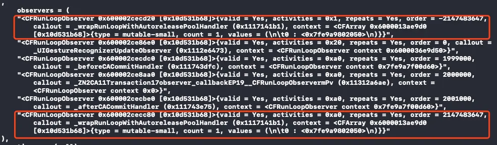 0xa0(16进制等于160,等于32+128) 对应的是 kCFRunLoopBeforeWaiting&kCFRunLoopExit,第二个 Observer 监视了两个事件: 准备进入休眠时调用 _objc_autoreleasePoolPop() 和 _objc_autoreleasePoolPush() 释放旧的池并创建新池;即将退出Loop时调用 _objc_autoreleasePoolPop() 来释放自动释放池。这个 Observer 的 order 是 2147483647,优先级最低,保证其释放缓存池发生在其他所有回调之后。