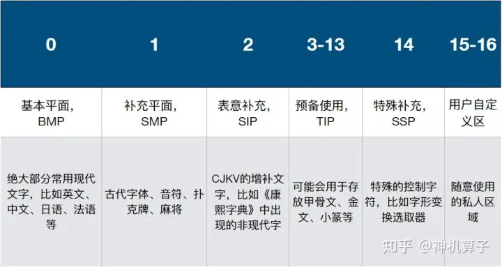 用途或意思相近的码点被划分到不同的组当中,叫做“平面”(plane)。目前一共规定了16个平面,目前只使用到了其中少数几个。