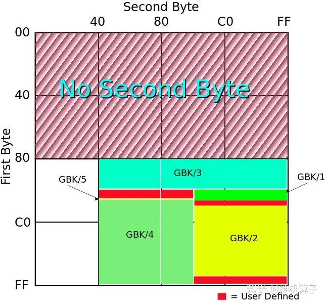 下图是GBK编码对2个字节的使用情况,这张图来自于维基百科。