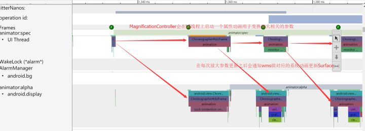 在System Server的主线程中有一个跟放大参数更新相关的属性动画在利用主线程的编舞者更新参数,其次在android.display线程上用于组织系统窗口动画的编舞者负责实际去更新放大界面的对应的Surface