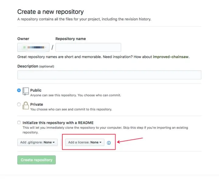 3. 进入创建 repository 页面后,输入基本信息后,点击右下角的 Add a license 选择开源协议,默认是 none。对应的 license 可以直接选择,也可以输入自己想要的 license