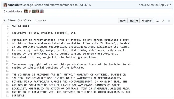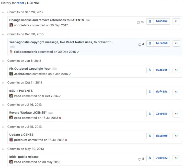 其中,要重点说一下 React 的开源协议,从 github 的提交历史来看,React 的开源协议经历了一个动荡的过程。从 LICENCE 的提交历史看,Facebook 对专利的重视程度可见一斑。