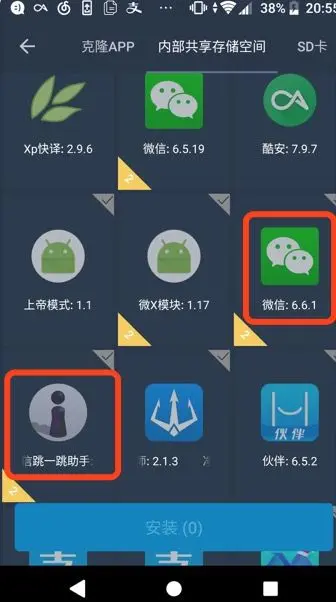 接下来,在手机上安装好VAExposed这个APP,然后把微信跟跳一跳辅助克隆或者从SD卡中安装到VAExposed中(这一步必须,APP必须安装在VAExposed中才能生效),如下图:
