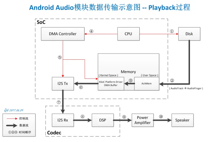 2、AudioFlinger 从匿名共享内存中读取音频数据,再通过 HAL 层接口将这些数据写入到 DMA 缓冲区(这一步操作将数据从用户空间拷贝到了内核空间);