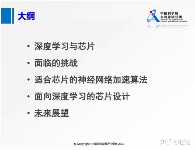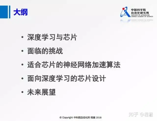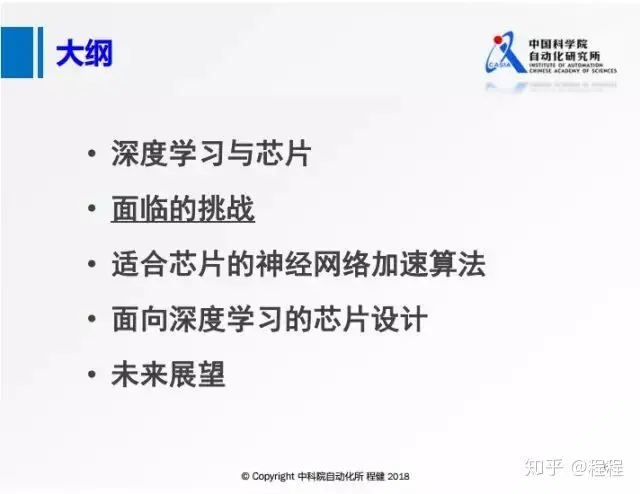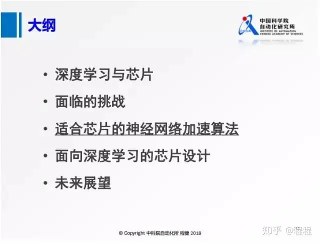 上图是本次汇报的大纲,主要从深度学习发展现状、面临的挑战、神经网络加速算法设计、深度学习芯片设计和对未来的展望五个方面来展开。