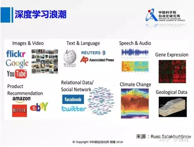 首先我们来看一下深度学习的发展现状。毋庸置疑的是深度学习目前在各个领域都取得了一些突破性的进展,上图展示了深度学习目前广泛应用的领域。