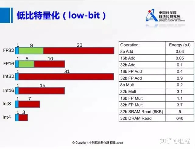 第三个方面是低比特量化,上图展示了具体操作方法。目前的低比特量化方法和上面提到的低秩分解、网络剪枝这两种方法是可结合的。左侧是不同的比特数在计算机上的存储方式,右侧是不同操作的功耗。可以看出来低比特的功耗远远小于高比特浮点数操作的功耗。