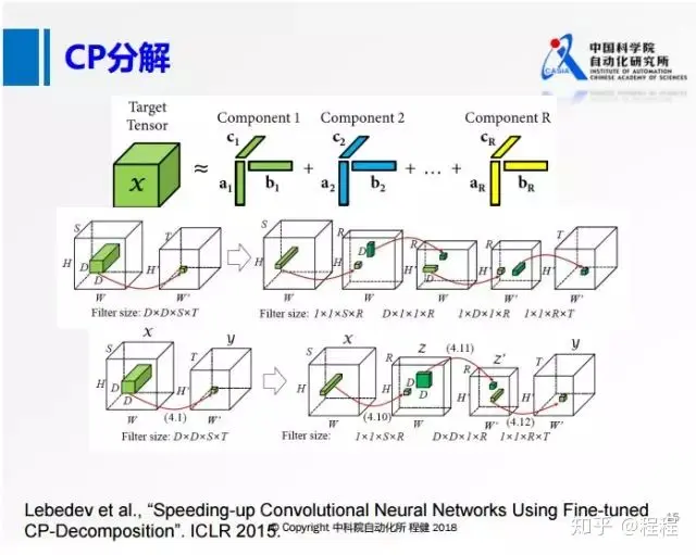 在SVD分解和Tucker分解之后的一些工作主要是做了更进一步的分解。上图展示了使用微调的CP分解加速神经网络的方法。在原来的四维张量上,在每个维度上都做类似1×1的卷积,转化为第二行的形式,在每一个维度上都用很小的卷积核去做卷积。在空间维度上,大部分都是3×3的卷积,所以空间的维度很小,可以转化成第三行的形式,在输入和输出通道上做低维分解,但是在空间维度上不做分解,类似于MobileNet。