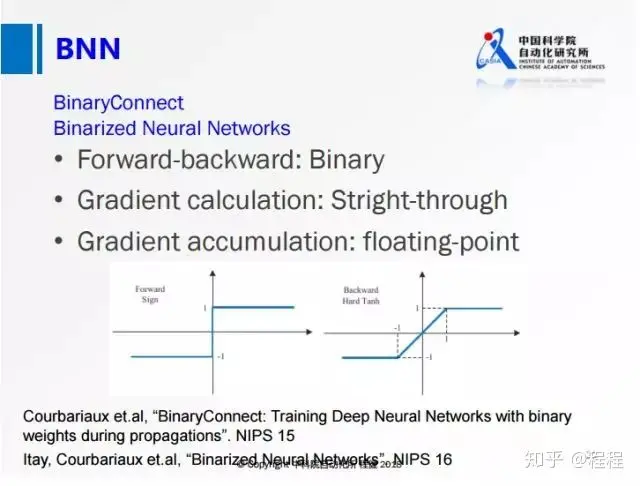 上图是在定点表示里面最基本的方法:BNN和BWN。在网络进行计算的过程中,可以使用定点的数据进行计算,由于是定点计算,实际上是不可导的,于是提出使用straight-through方法将输出的估计值直接传给输入层做梯度估计。在网络训练过程中会保存两份权值,用定点的权值做网络前向后向的计算,整个梯度累积到浮点的权值上,整个网络就可以很好地训练,后面几乎所有的量化方法都会沿用这种训练的策略。前面包括BNN这种网络在小数据集上可以达到跟全精度网络持平的精度,但是在ImageNet这种大数据集上还是表现比较差。
