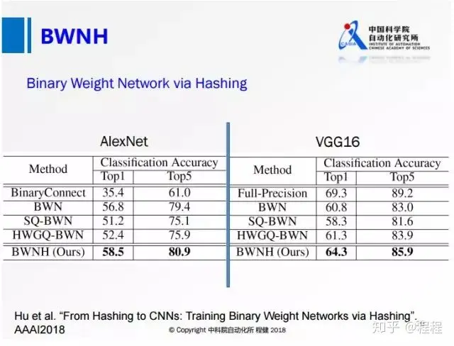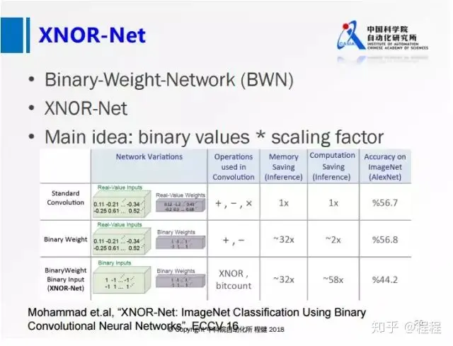 上图展示了ECCV2016上一篇名为XNOR-Net的工作,其思想相当于在做量化的基础上,乘了一个尺度因子,这样大大降低了量化误差。他们提出的BWN,在ImageNet上可以达到接近全精度的一个性能,这也是首次在ImageNet数据集上达到这么高精度的网络。