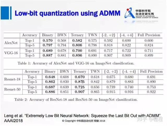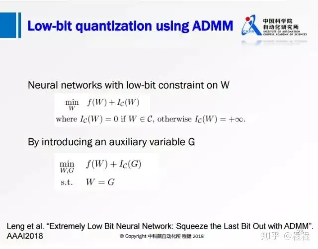 上图展示了阿里巴巴冷聪等人做的通过ADMM算法求解binary约束的低比特量化工作。从凸优化的角度,在第一个优化公式中,f(w)是网络的损失函数,后面会加入一项W在集合C上的loss来转化为一个优化问题。这个集合C取值只有正负1,如果W在满足约束C的时候,它的loss就是0;W在不满足约束C的时候它的loss就是正无穷。为了方便求解还引进了一个增广变量,保证W是等于G的,这样的话就可以用ADMM的方法去求解。