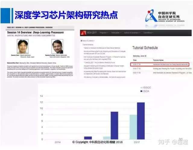 上图是2017年芯片设计两个顶会ISCA和ISSCC上与deep learning相关session情况,这两个会议上都有专门针对深度学习的讨论可以看出深度学习对芯片设计产生了巨大影响。