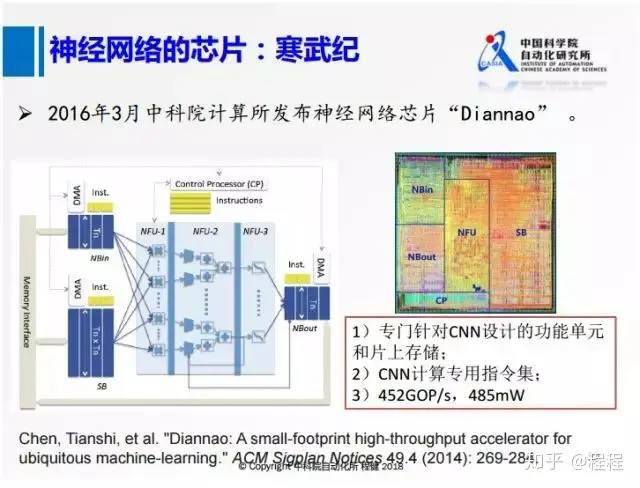 上图是中科院计算所研发的寒武纪。它在思想上实际和TPU有一点相似,实际中专门针对CNN设计了一些计算单元,还对常用的一些卷积神经网络中的操作专门设计了一些指令,这样芯片可以达到452GOP/s的高速度和485Mw的低功耗。