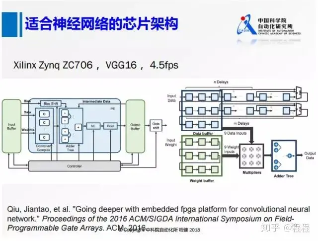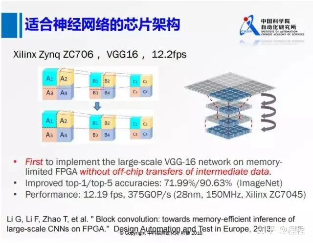 上图是清华大学2016年在FPGA平台上使用了VGG16所做的早期工作,采用类似正常网络的计算思路,在FPGA上实现了VGG16,可以达到4.5帧每秒的速度。