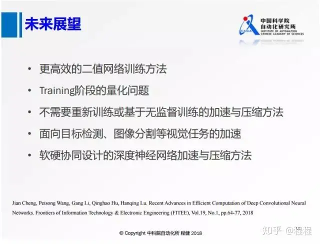 1. 首先前面提到的二值化方法大多都是针对权值的二值化,对这些网络的feature map做8比特的量化,很容易达到类似于feature map是浮点数的性能。如果我们能够把feature map也做成binary的话,无论是在现有的硬件还是在专用的硬件上都可以达到更好的性能。但是性能上还有很大损失。所以如何更高效地二值化网络也是未来研究的热点。