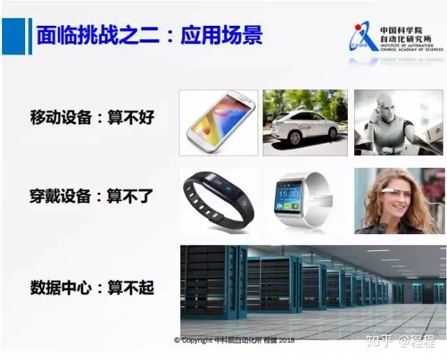 面临的挑战之二是深度学习复杂多变的应用场景,主要包括在移动设备上算不好、穿戴设备上算不了、数据中心算不起三个方面。由于移动设备和可穿戴设备本身硬件比较小,允许运行的计算量非常有限,在面临非常复杂多变的应用场景的时候,往往不能满足实际需求。而目前存在的一些移动中心的计算由于其代价昂贵使得大多数人只能望而却步。