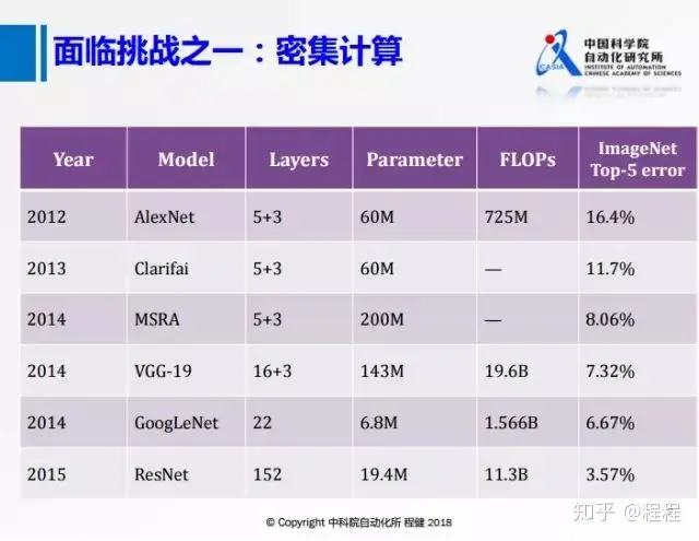 面临的挑战之一是越来越复杂的网络模型,上图展示了近年来主流网络模型的参数和计算量等信息。可以看出随着网络规模越来越大,网络结构越来越复杂,由此带来的越来越大的计算量会是一个挑战。