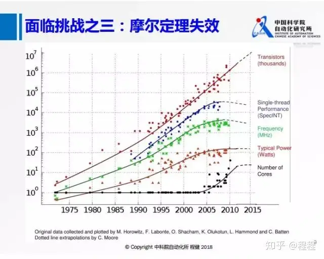面临的挑战之三是近年来摩尔定理随着时间推移的失效,不能像以前一样仅仅依靠在硬件上堆叠晶体管来实现物理层面的性能提升。