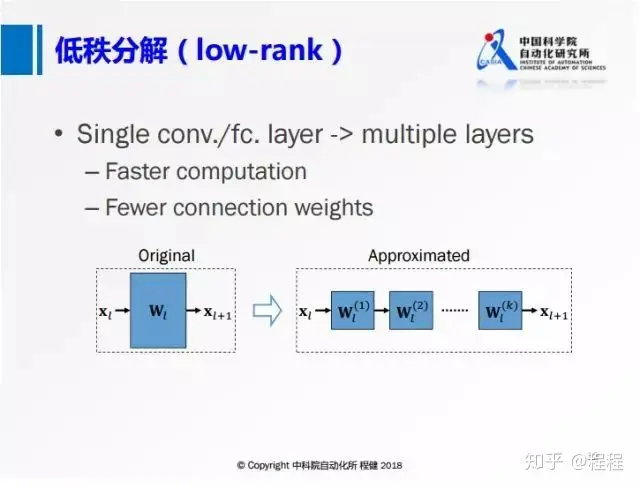 上图展示了低秩分解的基本思想,将原来大的权重矩阵分解成多个小的矩阵,右边的小矩阵的计算量都比原来大矩阵的计算量要小,这是低秩分解的基本出发点。