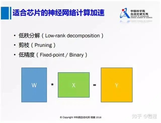 在深度学习模型的优化计算方面,包括一些最近几年研究的工作,上图展示了三种方式,下面主要列出了一些比较适合芯片的神经网络加速计算的方法。