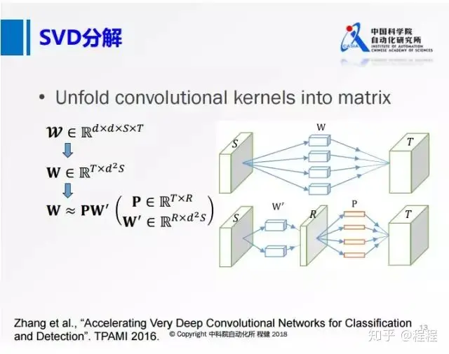 低秩分解有很多方法,最基本的是奇异值分解SVD。上图是微软在2016年的工作,将卷积核矩阵先做成一个二维的矩阵,再做SVD分解。上图右侧相当于用一个R的卷积核做卷积,再对R的特征映射做深入的操作。从上面可以看到,虽然这个R的秩非常小,但是输入的通道S还是非常大的。