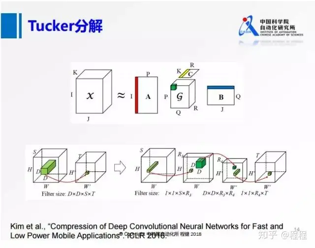 为了解决SVD分解过程中通道S比较大的问题,我们从另一个角度出发,沿着输入的方向对S做降维操作,这就是上图展示的Tucker分解的思想。具体操作过程是:将原来的卷积,首先在S维度上做一个低维的表达,再做一个正常的3×3的卷积,最后再做一个升维的操作。