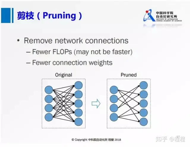 第二个方面是网络的剪枝,基本思想是删除卷积层中一些不重要的连接。