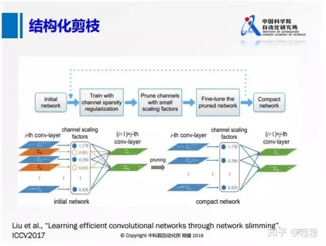 上图展示了在NIP2015上提出的非常经典的三阶段剪枝的方法。首先训练一个全精度网络,随后删除一些不重要的节点,后面再去训练权重。这种非结构化的剪枝的方法,虽然它的理论计算量可以压缩到很低,但是收益是非常低的,比如在现在的CPU或者GPU框架下很难达到非常高的加速效果。所以下面这种结构化的剪枝技术越来越多。