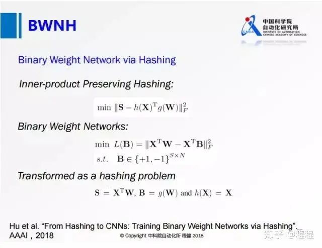 上图是我们今年通过Hashing方法做的网络权值二值化工作。第一个公式是我们最常用的哈希算法的公式,其中S表示相似性,后面是两个哈希函数之间的内积。我们在神经网络做权值量化的时候采用第二个公式,第一项表示输出的feature map,其中X代表输入的feature map,W表示量化前的权值,第二项表示量化后输出的feature map,其中B相当于量化后的权值,通过第二个公式就将网络的量化转化成类似第一个公式的Hashing方式。通过最后一行的定义,就可以用Hashing的方法来求解Binary约束。