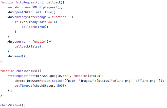 在status.js文件中,通过定时访问Google网站,监测其链接状态。如果链接正常,则显示绿色图标,否则显示红色图标。即更改icon。这里使用了chrome.browserAction.setIcon的接口。