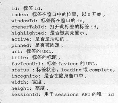 Chrome提供相应的API用来管理和操作标签对象。标签对象的数据结构为: