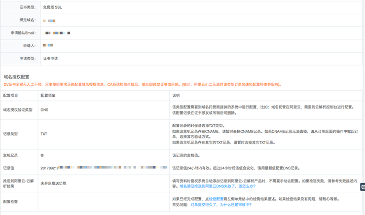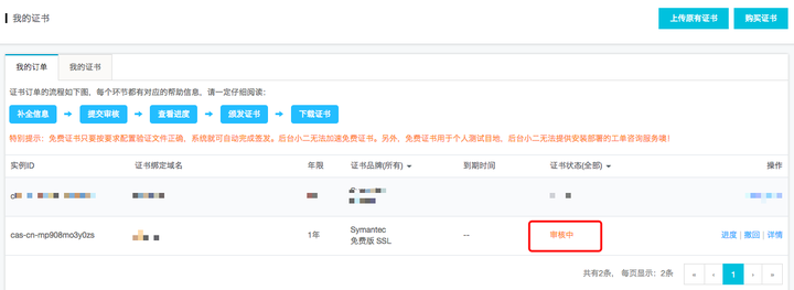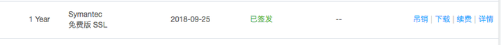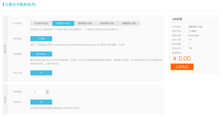 (4)选择“免费型DV SSL”,并点击立即购买。购买成功后跳转到“我的证书”页面: