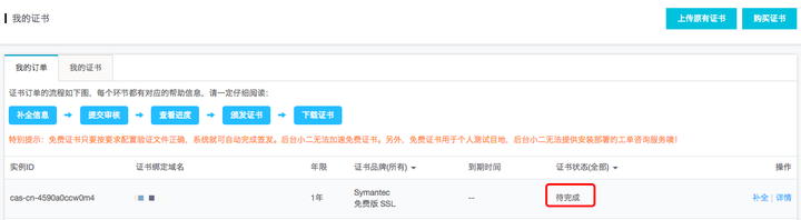 (5)此时的状态处于“待完成”,点击右侧“补全”按钮,补全域名信息: