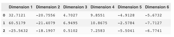 现在我们可以将PCA应用到数据集中,将原来的6维数据降维2维。