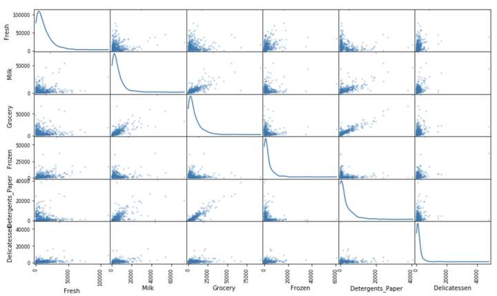 在图中能够看出某些特征具有较强的相关性,例如Milk和Grocery。