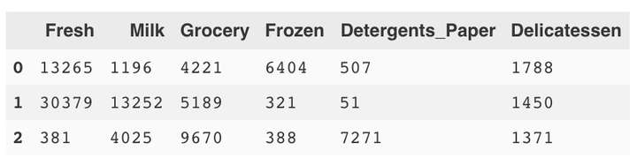 display(log_samples)我们发现数据值已经发生了变化,最明显的变化是都变小了,因为之前的特征都是正偏差。